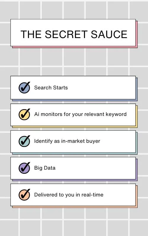 Our Ai actively scans the internet for individuals seeking products or services like yours. When we detect an initial search, we closely monitor their online behavior to gauge their buying intent. After engaging with two relevant pieces of content, we categorize them as potential buyer leads and promptly provide you with their contact information in real-time.